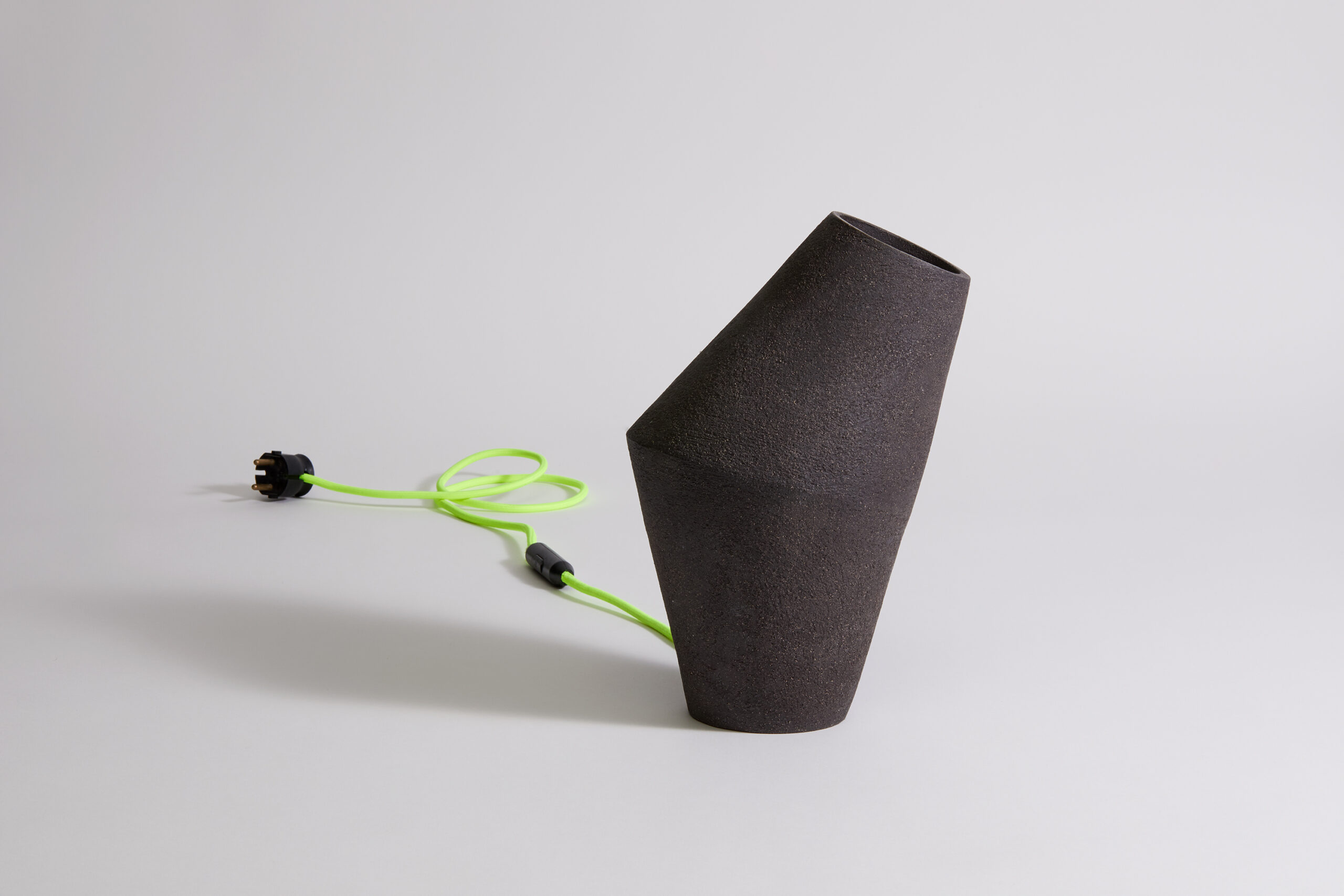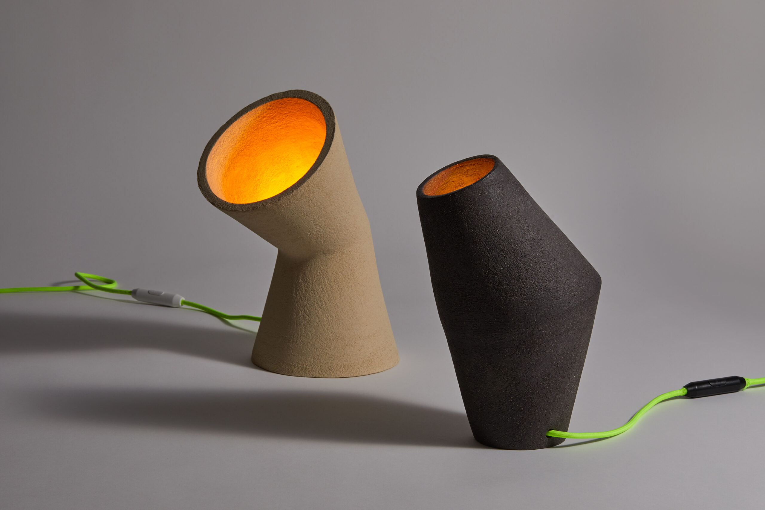 “Hug Lights” explores duality, balance, and emotional presence. Each lamp features two off-center, coiled cones in contrasting beige and black stoneware. The warm glow symbolizes the comfort of a meaningful hug, inviting connection and stillness into any space.