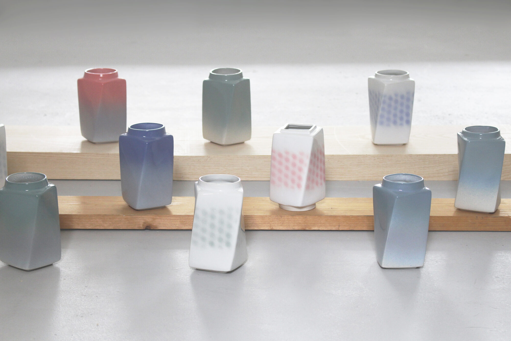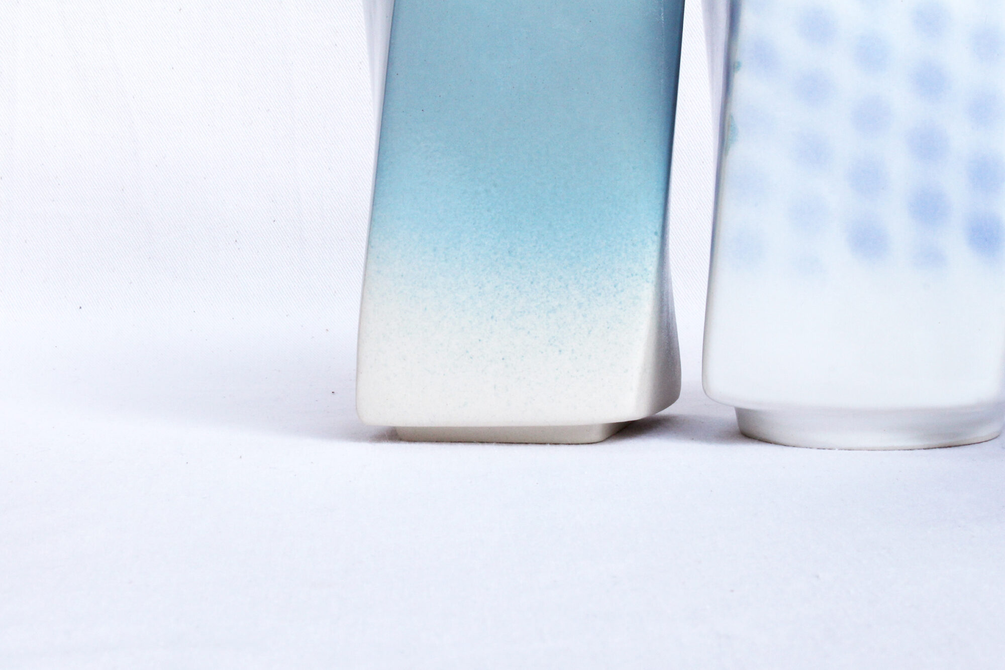 Slip casting stoneware, finished in different ways with different colored glazes and carefully signed underneath. Model is sculptured by hand in plaster.